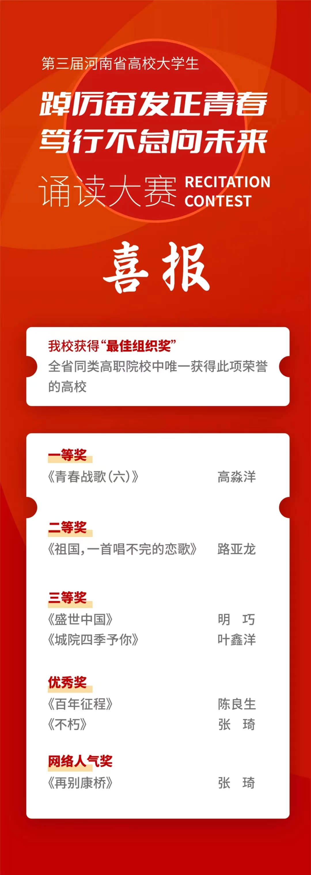 此次我校荣获多项荣誉,是我校全体师生共同努力的成果,学校连续两年获得全省高校大学生朗诵大赛“最佳组织奖”,充分彰显了我校实力和水平,进一步扩大了学校的社会知名度和影响力。